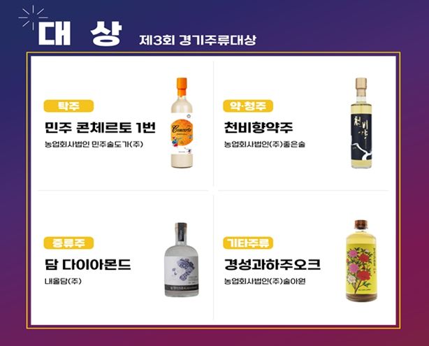 이번 대회에서 ㈜술아원의 ‘경성과하주오크’가 영예의 대상을 수상했고, 국순당여주명주㈜의 ‘려40’, ㈜추연당의 ‘백년향’이 각각 우수상을 차지했다. 대상·최우수상·우수상 등 총 12개의 상 가운데 여주시가 3개를 가져간 것이다. 단일 지자체가 3관왕에 오른 것은 여주시가 유일하다.
