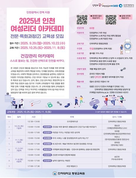[ 타임즈 - 김시창 기자 ] 인천광역시는 역량 있는 여성 인재를 발굴하고 육성하기 위해 인하대학교 평생교육원과 함께 ‘2025 인천 여성리더 아카데미’ 두 번째 전문・특화과정인 ‘건강관리 아카데미’ 교육생을 모집한다고 밝혔다.