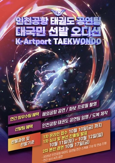 앞서 공사는 대한민국 국기(國伎) 태권도의 매력을 전 세계에 알리고 공항 이용객들에게 차별화된 고객경험을 제공하기 위해 태권도진흥재단과 협업해 올해 7월부터 9월까지 ‘인천공항 위대한 태권도’특별공연을 진행했으며, 특별공연 이후 해당공연을 정례화하기 위해 태권도 전문 공연팀을 공개 모집하게 됐다.