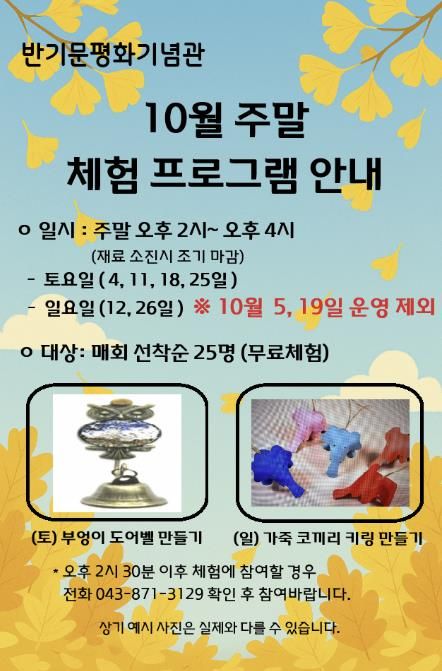[ 타임즈 - 김시창 기자 ] 음성군 제8대 유엔사무총장 반기문 평화기념관에서는 관람객을 위해 10월 주말 무료 체험 프로그램을 운영한다.