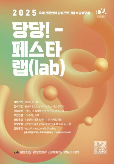 [ 타임즈 - 김시창 기자 ] (재)당진문화재단은 2025년 9월 26일부터 10월 17일까지 2025 축제 전문 인력 양성사업 ‘당당! 페스타 랩(lab)’ 참가자를 모집한다고 밝혔다.