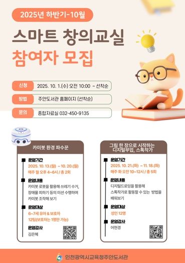 [ 타임즈 - 김시창 기자 ] 인천광역시교육청주안도서관은 10월 1일 오전 10시부터 ‘10월 스마트창의교실’ 참여자를 모집한다.