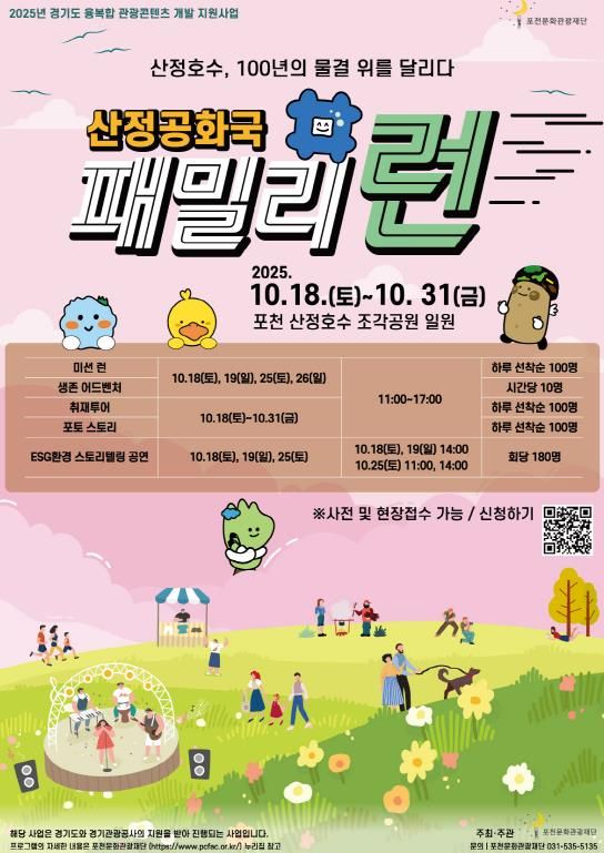 ‘산정공화국 패밀리런’은 경기관광공사 ‘2025 경기도 융복합 관광콘텐츠 개발 공모사업 기존 콘텐츠 운영’ 부문에 선정돼 총 5천만 원의 도비를 지원받았다. 경기도는 지역성과 참신성, 가족 단위 맞춤 기획력을 높이 평가했으며, 지난해 시범 운영을 통해 검증된 본 사업이 올해 한층 강화된 완성도로 돌아오게 됐다.