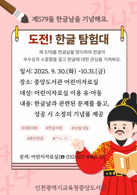 [ 타임즈 - 김시창 기자 ] 인천광역시교육청중앙도서관은 제579돌 한글날을 맞아 9월 30일부터 10월 31일까지 어린이들이 즐겁게 한글을 배우고 도서관을 체험할 수 있는 특별행사 ‘도전! 한글 탐험대!’를 운영한다.