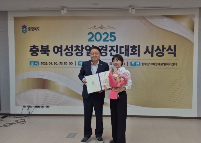 [ 타임즈 - 김시창 기자 ] 지난 9월 30일 충청북도의회 워크숍실에서 열린 ‘2025 충북 여성창업 경진대회’에서 제천여성새로일하기센터 지연옥씨(바닐라유닛/사용자 프로파일 기반 AI 지역정보 추천 플랫폼 ‘오늘의 제천’)가 우수상을 받았다.