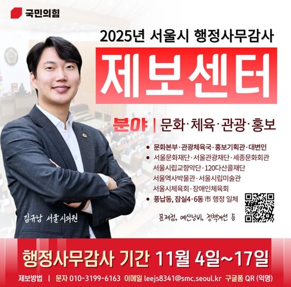 [ 타임즈 - 김시창 기자 ] 김규남 서울시의원(송파1·국민의힘)은 오는 11월 4일부터 17일까지 열리는 2025년도 서울시 행정사무감사를 앞두고 시민 참여를 위한 제보센터를 운영한다고 30일 밝혔다.