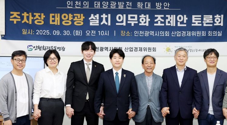 인천시의회 산업경제위원회는 30일 세미나실에서 ‘인천의 태양광 발전 확대 방안, 주차장 태양광 설치 의무화 조례안 토론회’를 개최했다.