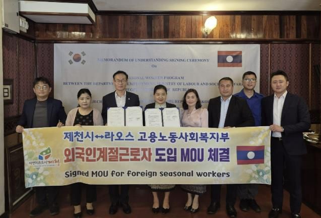 [ 타임즈 - 김시창 기자 ] 제천시는 지난 9월 30일 라오스 노동사회복지부와 외국인 계절근로자 도입을 위한 신규 업무협약(MOU) 을 체결했다. 이번 협약은 농번기 원활한 인력 공급을 위해 추진된 것으로, 특히 농촌 인력 공급 국가를 다변화해 불확실성을 최소화하는 데 목적이 있다.