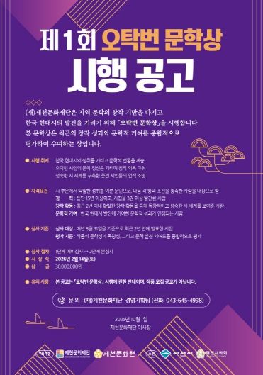 [ 타임즈 - 김시창 기자 ] (재)제천문화재단(이사장 김상수)은 지역 문학의 창작 기반을 다지고 한국 현대시의 발전을 기리기 위해 제천문화재단 제1회'오탁번 문학상'을 공고했다. 이번 문학상은 최근의 창작 성과와 문학적 기여를 종합적으로 평가하여 수여하는 상으로, 오탁번 시인의 문학 정신을 기리고 문학적 전통을 계승하는데 그 취지가 있다.