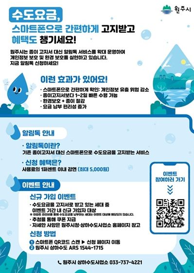 [ 타임즈 - 김시창 기자 ] 원주시상하수도사업소는 ‘수도요금 알림톡 서비스’ 확대를 위해 10월 1일부터 12월 7일까지 신규 가입 이벤트를 진행한다.