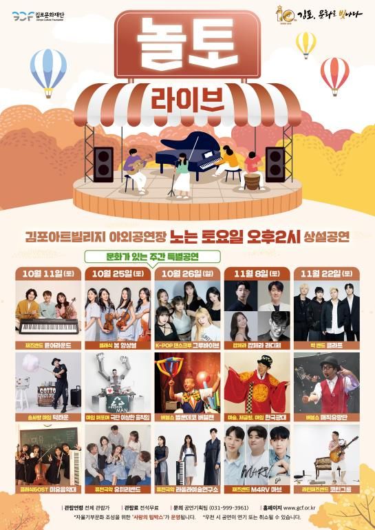[ 타임즈 - 김시창 기자 ] (재)김포문화재단은 10월 11일부터 11월 22일까지 매월 둘째, 넷째 주 토요일마다 김포아트빌리지 야외공연장에서 하반기 토요상설공연 '놀토 라이브'를 개최한다고 밝혔다.