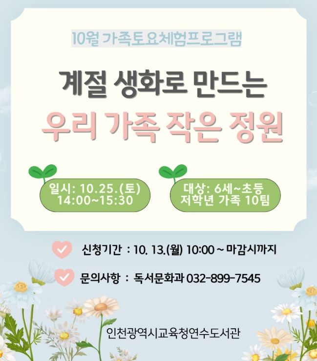 [ 타임즈 - 김시창 기자 ] 인천광역시교육청연수도서관은 오는 10월 25일 오후 2시 평생학습1실에서 가족 이용자를 위한 ‘10월 가족 토요체험 프로그램’을 운영한다.