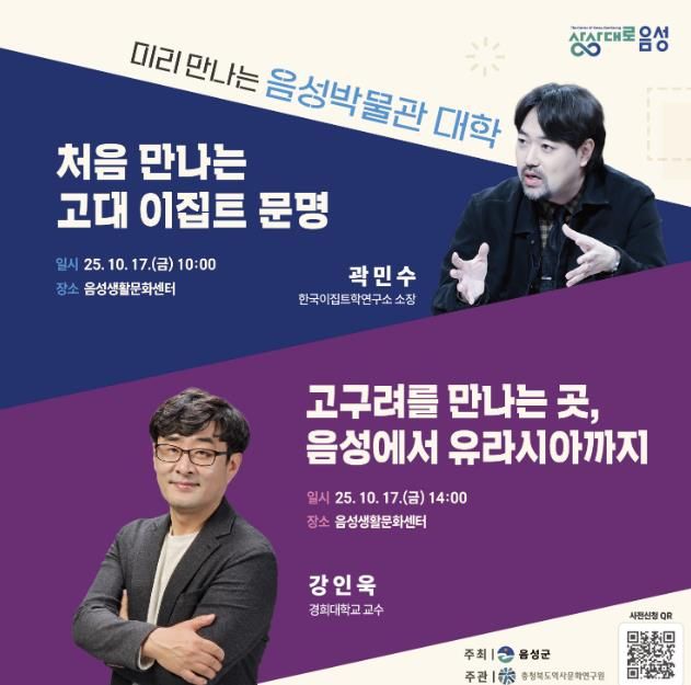 방송과 온라인에서 활발하게 활동하며 ‘애굽민수’라는 애칭으로 잘 알려진 국내 최고 이집트 고고학자 곽민수 한국이집트학연구소장과 경희대학교 사학과 교수이자 한국 고대사 고고학 연구소장인 강인욱 교수를 초청해 음성군과 이집트 및 유라시아 문화에 관한 연관성에 대해 강의할 예정이다.