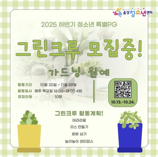 모집 기간은 이달 13일부터 24일까지이며, 모집 인원은 총 10명이다. 접수는 음성군에 거주하고 있는 청소년을 대상으로 포스터에 있는 QR코드를 통해 선착순으로 진행한다.