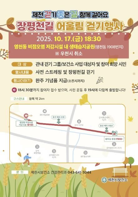 행사는 오후 6시 30분, 영천동 비점오염 저감시설 내 생태습지공원(영천동 1908번지)에서 진행된다. 현장 등록을 마친 후에는 대원대학교 김현태 교수의 지도 아래 사전 스트레칭과 올바른 걷기 교육이 진행되며, 오후 7시에 참가자 전원이 함께 출발할 예정이다.