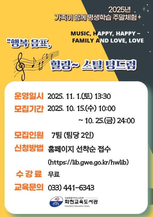 [ 타임즈 - 김시창 기자 ] 강원도교육청 화천교육도서관은 군민을 대상으로 2025년 11월 평생학습 주말체험 ‘늦가을, 가족 음악 특강: 행복 음표, 힐링 스틸 텅드럼’을 운영한다.