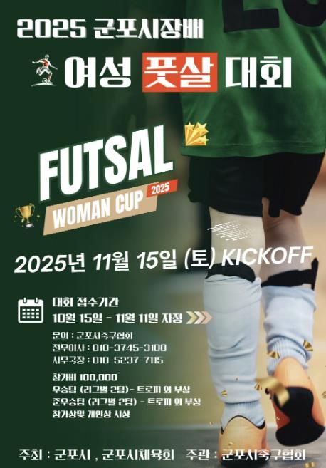 [ 타임즈 - 김시창 기자 ] 군포시는 여성 생활체육 참여 확대와 건전한 스포츠 문화 확산을 위해 ‘2025 군포시장배 여성 풋살대회’를 오는 11월 15일(토) 군포시 국민체육센터 축구장에서 개최한다.