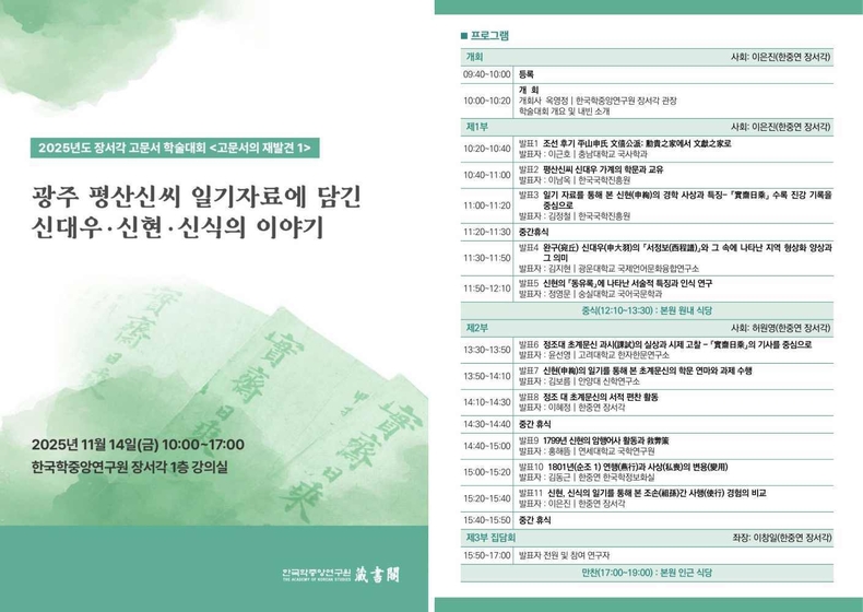 올해 학술대회는 한국학중앙연구원 장서각이 2022년부터 2024년까지 역주한 광주 평산신씨 신대우(申大羽)·신현(申絢)·신식(申植)의 일기 4종 8점을 중심으로, 조선 후기 지식인의 학문과 관직, 유람, 사행 등 양반 사회의 문화를 다각적으로 조명하는 자리다.