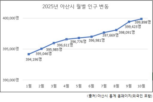 10월 말 기준 아산시 인구수는 외국인 포함 약 39만 9,898명으로, 102명이 더 늘면 ‘인구 40만’ 고지를 넘게 된다. 최근 매달 500~600명가량이 꾸준히 늘어나는 추세를 감안하면, 이달 중으로 40만 명 돌파가 확실시된다.