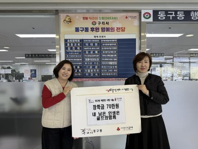 [ 타임즈 - 김시창 기자 ] 구리시 동구동 행정복지센터는 지난 18일 동구동 행정복지센터 대회의실에서 '내 남은 인생은 골프와 함께' 모임으로부터 관내 취약계층 청소년을 위한 장학금 70만 원을 기탁받았다고 밝혔다.