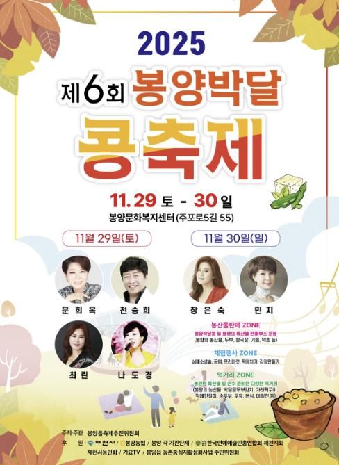 이번 축제는 봉양읍 농촌중심지활성화사업 마을협의체가 마을 주민의 화합과 농산물 판매 증대를 위해 기획한 행사로, 가요TV를 초청해 여러 가수가 출연하는 신나는 공연도 준비되어 있어 방문객들에게 풍성한 즐길 거리를 제공할 계획이다.
