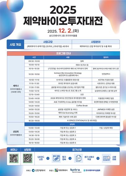 [ 타임즈 - 김시창 기자 ] 인천광역시가 주최하고 인천관광공사와 KOTRA, 한국제약바이오협회가 공동 주관하는 ‘제약바이오투자대전’이 오는 12월 2일 인천 송도컨벤시아 프리미어볼룸에서 열린다.