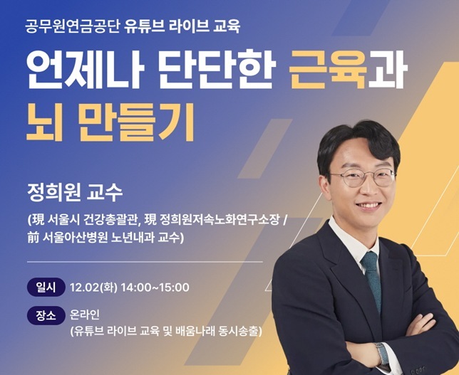 [ 타임즈 - 김시창 기자 ] 공무원연금공단(이사장 김동극, 이하 ‘공단’)은 전·현직공무원의 건강관리를 지원하기 위해 12월 2일 14시, 공단 유튜브(Youtube) 채널과 온라인 평생교육 플랫폼 「배움나래」를 통해 유튜브 실시간(Live) 교육을 실시한다고 밝혔다.