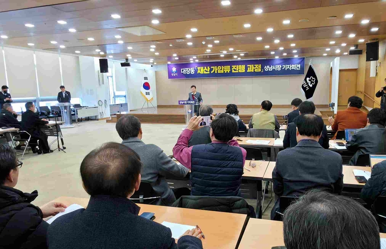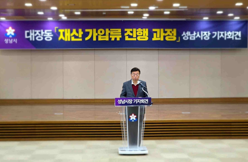 [ 타임즈 - 김시창 기자 ] 성남시(시장 신상진)는 9일 오전 성남시청 한누리실에서 기자회견을 열고 대장동 범죄수익 환수를 위한 가압류 진행 상황을 공개했다. 신상진 성남시장은 대장동 개발 비리로 발생한 부당 수익을 반드시 시민들에게 돌려놓겠다며 단돈 1원이라도 끝까지 환수하겠다고 강조했다.
