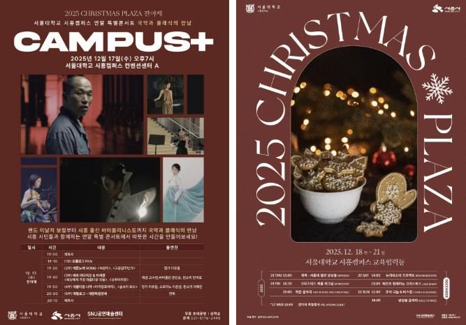 [ 타임즈 - 김시창 기자 ] 시흥시와 서울대학교 시흥캠퍼스가 오는 12월 17일부터 21일까지 특별 행사인 ‘2025 크리스마스 플라자(CHRISTMAS PLAZA)’를 개최한다. 올해 행사는 단 하루만 열리는 전야제 특별콘서트 ‘캠퍼스 플러스’를 중심으로, 국악과 클래식을 대표하는 최정상급 연주자들이 한자리에 모여 연말 분위기를 고조시킬 예정이다.