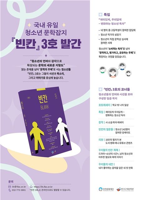 [ 타임즈 - 김시창 기자 ] 인천문화재단 한국근대문학관은 국내 유일의 청소년 문학잡지 [빈칸] 3호를 발간했다.