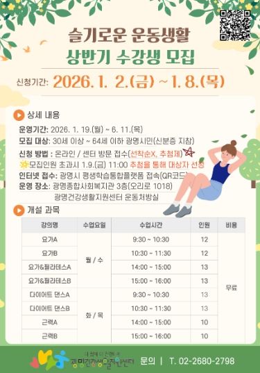 [ 타임즈 - 김시창 기자 ] 광명시 광명건강생활지원센터는 새해를 맞아 시민들의 건강한 생활습관 형성과 만성질환 예방을 위해 2026년 상반기 ‘슬기로운 운동생활’ 운동 프로그램 참여자를 모집한다.