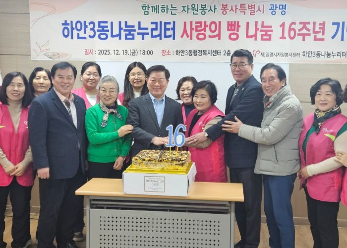 [ 타임즈 - 김시창 기자 ] 광명시 하안3동 나눔누리터는 광명시자원봉사센터, 하안3동 행정복지센터와 함께 지난 19일 하안3동 행정복지센터 2층 회의실에서 ‘사랑의 빵 나눔’ 16주년 기념식을 개최했다.