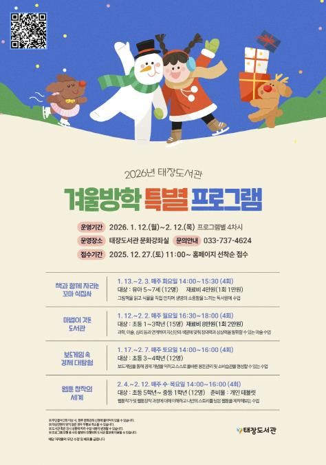 [ 타임즈 - 김시창 기자 ] 원주시 태장도서관은 겨울방학을 맞아 1월 12일부터 2월 12일까지 겨울방학 특별 프로그램을 운영한다.