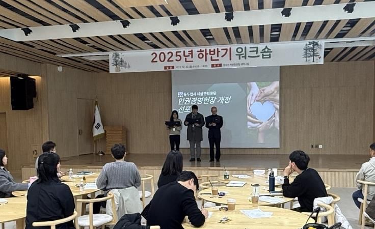 [ 타임즈 - 김시창 기자 ] 동두천시 시설관리공단은 지난 22일 동두천 자연휴양림 세미나실에서 열린 2025년 하반기 워크숍에서 인권경영 헌장 개정 및 선포식을 개최했다고 밝혔다.