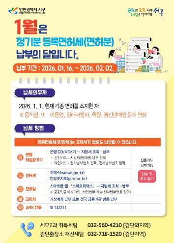 [ 타임즈 - 김시창 기자 ] 인천 서구는 2026년도 1월 정기분 등록면허세 8만5천여 건, 28억9천4백만 원을 부과하고 올해 2월 2일까지 납부를 당부하는 등 적극적인 홍보에 나섰다.