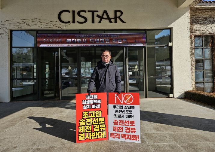 [ 타임즈 - 김시창 기자 ] 제천 신평창-신원주 송전선로 건설사업 반대추진위원회 신창준 위원장은 지난 14일 영월 동강시스타에서 열린 제5차 입지선정위원회 회의장 앞에서 1인 시위를 벌이고, 송전선로 건설계획 중단과 입지 선정 절차의 전면 재검토를 강력히 촉구했다.