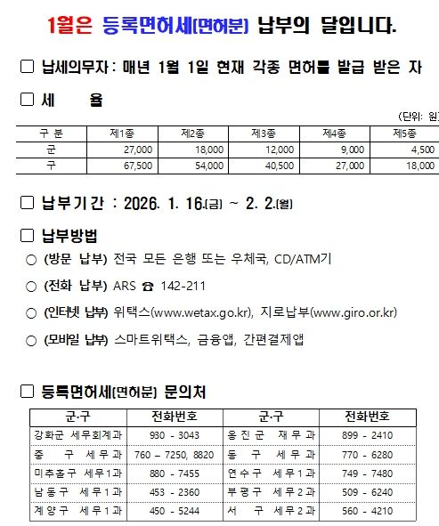 [ 타임즈 - 김시창 기자 ] 인천광역시는 2026년 정기분 등록면허세(면허분) 396,262건, 총128억 원을 부과·고지했다고 밝혔다.