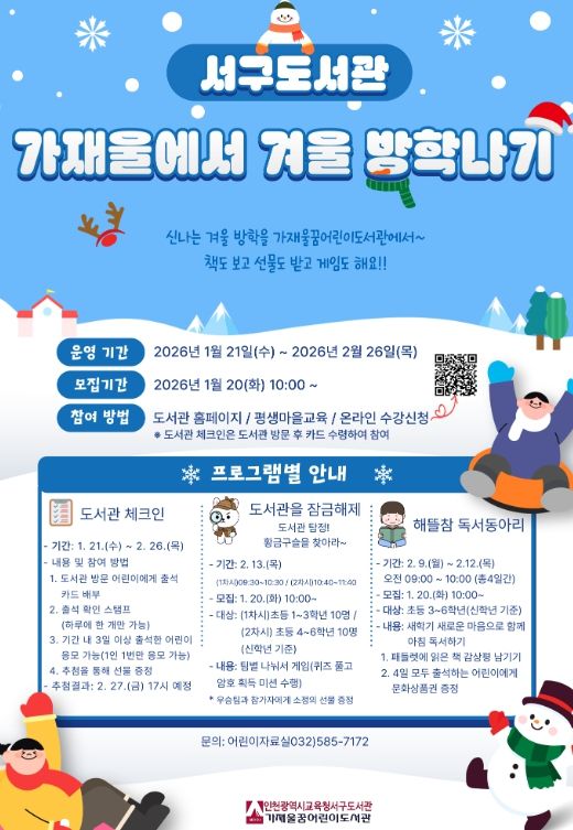 [ 타임즈 - 김시창 기자 ] 인천광역시교육청서구도서관은 겨울방학을 맞이한 어린이들이 도서관에서 특별하고 즐거운 경험을 쌓을 수 있는 '가재울에서 겨울 방학나기'를 21일부터 운영한다.