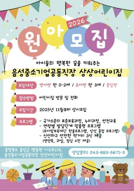 [ 타임즈 - 김시창 기자 ] 음성군은 중소기업 근로자의 보육환경 개선과 일·가정 양립 문화 확산을 위해 운영 중인 중소기업 공동직장어린이집 ‘상상어린이집’의 원아를 모집한다.