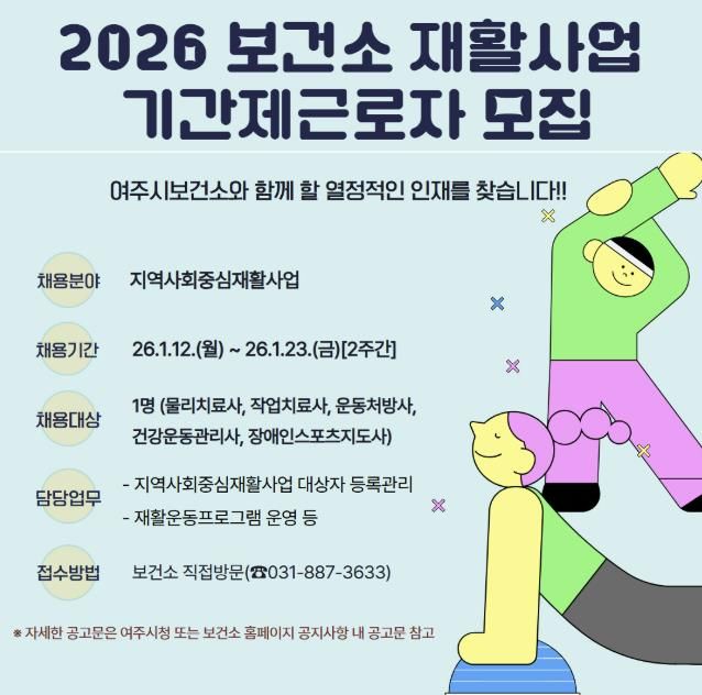 [ 타임즈 - 김시창 기자 ] 여주시보건소는 지역 내 등록장애인과 예비장애인들의 건강관리를 위한 지역사회중심재활사업 추진을 위해 1월 12일부터 1월 23일까지 2주간 기간제근로자 채용 공고를 실시한다.