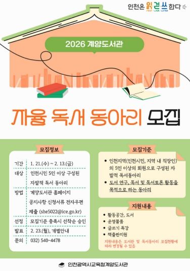 [ 타임즈 - 김시창 기자 ] 인천광역시교육청계양도서관은 지역 내 독서 문화를 확산하고 시민의 자발적인 독서 활동을 지원하기 위해 ‘2026년 자율 독서동아리’를 모집한다.