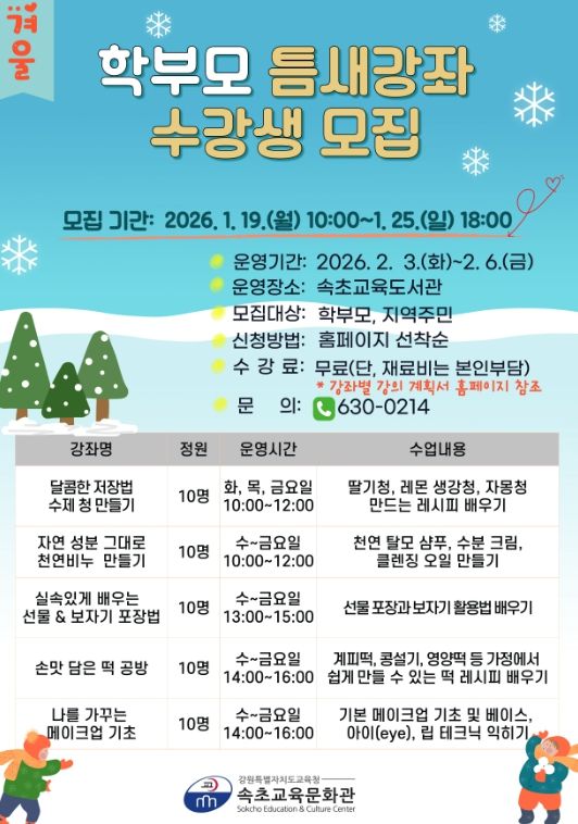 수강 신청은 1월 19일 오전 10시부터 25일 오후 6시까지 속초교육문화관 누리집에서 선착순으로 신청할 수 있다.