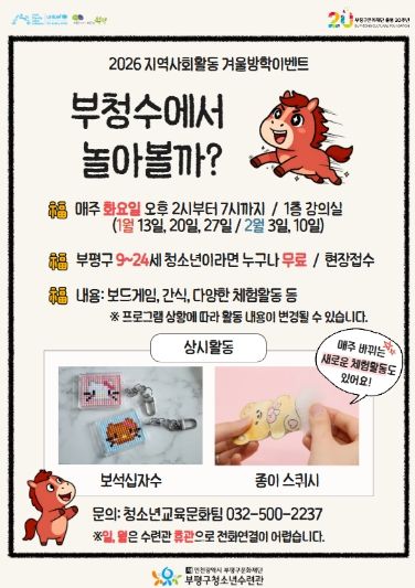 [ 타임즈 - 김시창 기자 ] 부평구 청소년수련관은 오는 20일부터 다음달 10일까지 겨울방학을 맞아 지역 청소년을 위한 2026 지역사회활동 겨울방학 이벤트 ‘부청수에서 놀아볼까’를 진행한다.