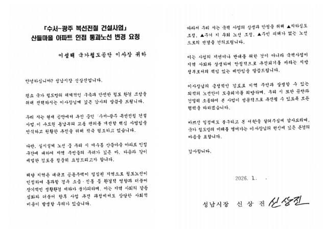 [ 타임즈 - 김시창 기자 ] 성남시는 지난 16일 김윤덕 국토교통부 장관과 이성해 국가철도공단 이사장에게 ‘수서~광주 복선전철(이하 수광선) 건설사업’과 관련하여 여수동 산들마을 아파트 인접 통과 구간의 노선 변경을 요청하는 서한을 전달했다고 20일 밝혔다.
