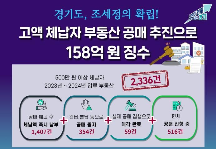 [ 타임즈 - 김시창 기자 ] 경기도가 2025년 3월부터 11월까지 약 9개월간 부동산 공매를 집중 추진한 결과, 지방세를 체납한 788명으로부터 총 158억 원을 징수했다고 22일 밝혔다.