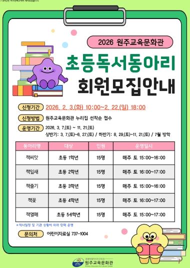 [ 타임즈 - 김시창 기자 ] 원주교육문화관(관장 용석태)은 2월 3일부터 선정 도서를 깊이 읽는 활동을 통해 문해력을 강화하고 지역사회 독서 공동체를 활성화하기 위해 초등학생과 중학생을 대상으로 ‘2026년 독서동아리 회원 모집’을 실시한다.