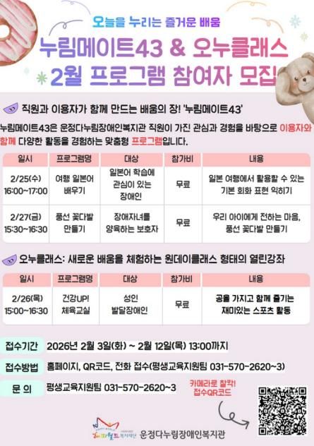 [ 타임즈 - 김시창 기자 ] 파주시 운정다누림장애인복지관은 참여형 평생학습 프로그램 ‘누림메이트43’을 운영하며, 정규 강좌로는 담기 어려운 소규모 학습 수요를 반영한 생활 밀착형 배움을 실천하고 있다.