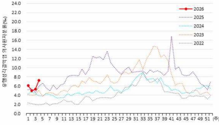 질병관리청 표본감시 자료에 따르면, 1월 넷째 주 유행성결막염 의사환자 분율은 인구 1,000명당 7.2명으로 집계됐다. 이는 전주(5.3명)보다 증가한 수치로, 2022년부터 2025년까지 최근 4년간 같은 기간과 비교해도 가장 높은 수준이다.