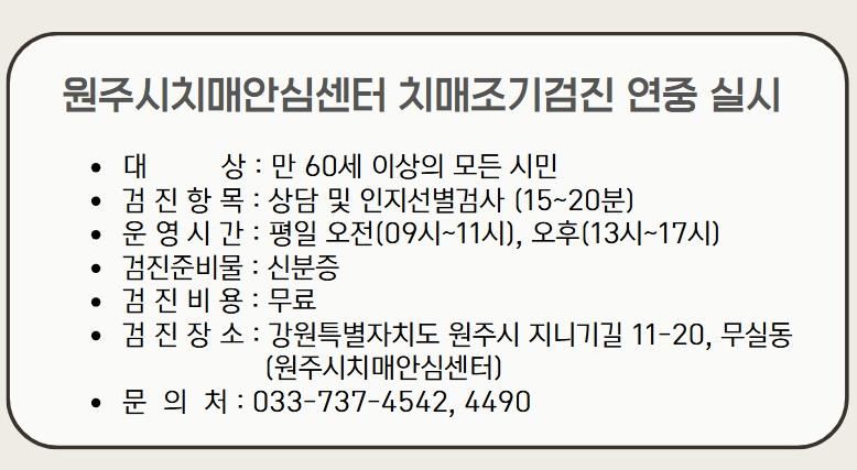 [ 타임즈 - 김시창 기자 ] 원주시치매안심센터는 치매 조기 발견과 적기 치료를 위해 지역 내 60세 이상 주민을 대상으로 치매 조기 검진 사업을 연중 실시하고 있다.