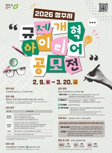 [ 타임즈 - 김시창 기자 ] 청주시는 시민이 체감할 수 있는 다양하고 창의적인 규제개혁 아이디어를 발굴해 일상생활과 경제활동을 제약하는 규제를 적극 개선하고자 ‘2026 청주시 규제개혁 아이디어 공모전’을 개최한다고 8일 밝혔다.
